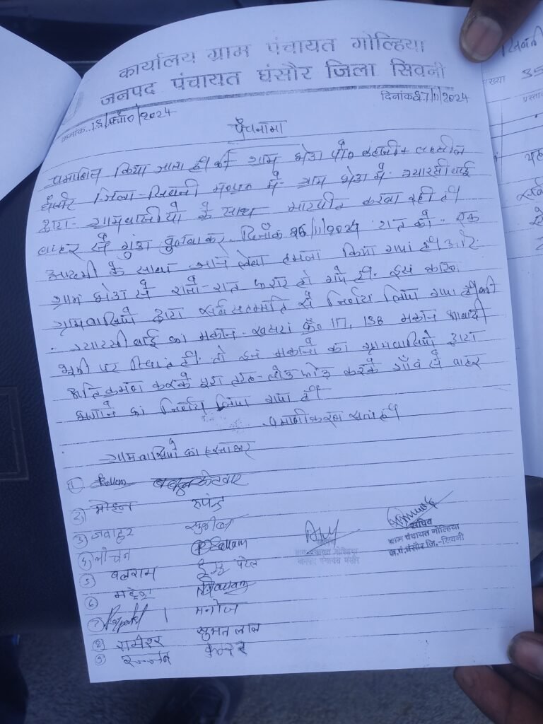 सिवनी – आपने अभी तक दबंग तो बहुत से सुने होंगे लेकिन दबंग लेडी नही सुना होगा जिससे गाॅव के लोग इतने परेशान हो जाये कि उन्हे उसे गाॅव से बाहर निकालने एकजुट हो मोर्चा खोलना पडे और ग्रामसभा का आयोजन होकर एकमत से यह फैसला लिया जाये कि इसे गाॅव से बाहर निकाला जाये ऐसा ही एक शिकायत लेकर ग्राम भेडा ग्राम पंचायत गोल्हिया जनपद पंचायत घंसौर के लोगो ने आकर कलेक्टर को ज्ञापन सौपते हुए बताया कि ग्राम में एक महिला ग्यारसीबाई जो कि कुछ वर्षो पहले बाहर से आकर निवास कर रही है जो कि आबादी की भूमि जिसका खसरा नंबर 117,138 पर मकान बनाकर परिवार के साथ रह रही है जिसके बाद दिनाॅंक 18 नवम्बर 2024 को उक्त महिला के द्वारा बाहर से गंुडे बुलवाकर ग्राम के ही राधेश्याम बलराम लोधी को ग्राम के लोगो के सामने मारपीट करवाई और ग्रामवासियो को धमकी दी कि अगर किसी ने बोला तो 376 का मामला बनवाकर फसवा दूंगी तथा अभी तक ग्राम के कई लोगो को 354 में फंसा चुकी है। इसलिए ग्रामीणो का कहना था कि हमने निर्णय लिया है कि उक्त महिला को ग्राम से तत्काल हटाया जाये जिसका मकान जेसीबी से गिराया जाये क्योकि उक्त महिला के उपर ग्रामीणो ने एक और गंभीर आरोप मढते हुए बताया कि उक्त महिला गर्मी के दिनो में तस्करी का भी काम करती है। इसके अलावा ग्रामीणो का यह भी कहना था कि उक्त महिला से ग्रामीणो में दहशत का माहौल इस बात को लेकर बना हुआ है कि वह कभी भी किसी भी मामले किसी को भी फॅसा सकती है अब आगे देखना होगा कि पुसिल प्रशासन इस मामले में क्या कार्रवाई करता है।