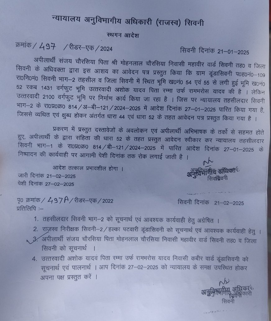 सिवनी – नगर के के एक पीडित द्वारा अवैध रूप से डूंडासिवनी में हो रहे निर्माण की रोक लगाने के लिए गुहार लगाई जाती है तो वहा से एक पत्र जारी होता है जिसमें सबसे पहले लिखा होता है न्यायालय अनुविभागीय अधिकारी ( राजस्व ) सिवनी जिसके बाद पत्र के उपर बीचो बीच स्थगन आदेश नीचे बांयी ओर क्रमांक/497 /रीडर – एक / 2024 न्यायालय अनुविभागीय अधिकारी (राजस्व) सिवनी जिसके दूसरे तरफ सिवनी दिनांक 21-01-2025 लिखा होता है जिसके बाद लिखा होता है अपीलार्थी संजय चैरसिया पिता श्री मोहनलाल चैरसिया निवासी महावीर वार्ड सिवनी तह० व जिला सिवनी के अधिवक्ता द्वारा इस आशय का आवेदन पत्र प्रस्तुत किया कि ग्राम डूंडासिवनी प०ह०नं0-109 रा०नि०म० सिवनी भाग-2 तहसील व जिला सिवनी में स्थित भूमि ख0नं0 54 एवं 55 से लगी हुई भूमि ख०नं० 52 रकब 1431 वर्गफुट भूमि उत्तरवादी अशोक यादव पिता रम्मा उर्फ रामभरोस यादव की है। लेकिन उत्तरवादी 2100 वर्गफुट भूमि पर निर्माण कार्य किया जा रहा है। जिस पर न्यायालय तहसीलदार सिवनी भाग-2 के रा०प्र०क्र० 814/अ-बी-121/2024-2025 में आदेश दिनांक 27-01-2025 पारित किया गया है, जिससे व्यथित एवं क्षुब्ध होकर अंतर्गत धारा 44 एवं धारा 52 के तहत आवेदन पत्र प्रस्तुत किया गया है।