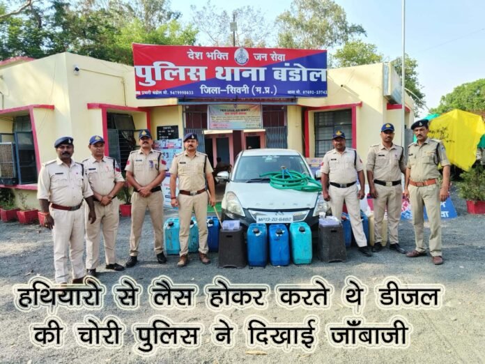 सिवनी – दिनाँक 03 अपै्रल 25 की सुबह गस्त के दौरान बंडोल पुलिस को खबर मिलती है कि एनएच 44 रोङ पर ग्राम राहीवाङा मे सूचना मिलने पर कि एक सफेद रंग की कार में तीन लोग आकर डंफर के डीजल टैंक से डीजल चुराकर सिवनी की ओर भागे है। मामले की जानकारी लगते ही पुलिस तत्काल हरकत में आती है जिसके बाद तत्काल गस्त में लगे कर्मचारी प्रधान आरक्षक अमर उईके, आरक्षक नीरज राजपूत एवं 100 डायल में लगे स्टाफ अपनी जान जोखिम मे डालकर उक्त गाडी को पकडने पीछा किया गया जिसके बाद पुलिस को एक बिना नंबर की सफेद रंग की स्विफट कार को नेशनल हाईवे मे दबोचा जाता है जिसके बाद कार में सवार तीन डीजल चोर अंधेरे का फायदा उठाकर भाग गये। कार को चेक करने पर उसमें 35-35 लीटर की 03 केन में करीब 100 लीटर डीजल एवं 05 केन खाली, एक डंडा, एक देशी कटटा, कारतूस, गाडी की नंबर प्लेट, डीजल निकालने के पाईप एवं कटर आदि सामग्री को जप्त किया गया था।