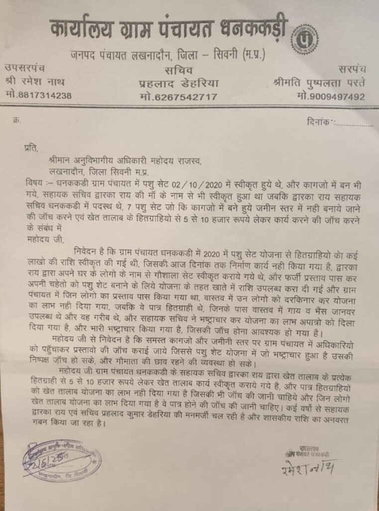 लखनादौन – धनककड़ी पंचायत में भ्रष्टाचार का नग्न नृत्य – पशु शेड और खेत तालाब योजनाओं में खुली लूट का आरोप, उच्च स्तरीय जांच की मांग’