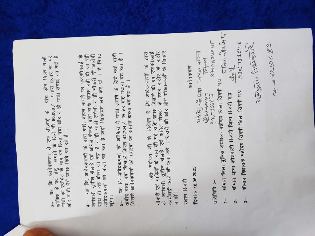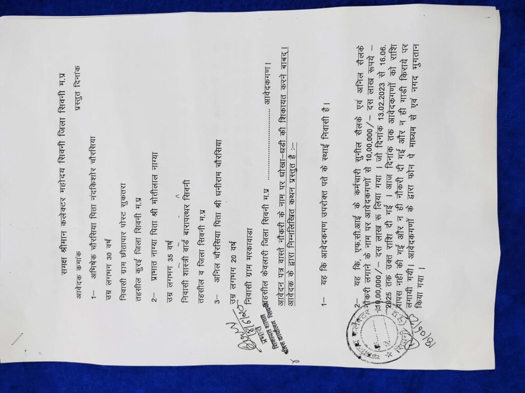 आगे पीडितो ने बताया कि एफसीआई के कर्मचारी सुनील सैलके एवं अनिल सैलके ने नौकरी लगाने के नाम पर उपरोक्त लोगो से दस – दस लाख रूपये ले लिया। जिसमें दिनाॅंक 13 फरवरी 2023 से लेकर 16 जून 2025 तक उक्त राशि दी गई। इस मामले में ठगो ने ना तो नौकरी ही दी और ना ही पीडितो को उनका पैसा वापस किया इस मामले में पीडितो ने बताया कि उनसे गाडी लगाने के नाम पर 50 – 50 हजार रूपये भी ठगी के आरोपियो ने लिये जिनका पेमेंट बाकायदा फोन पे और नगद भुगतान किया गया।