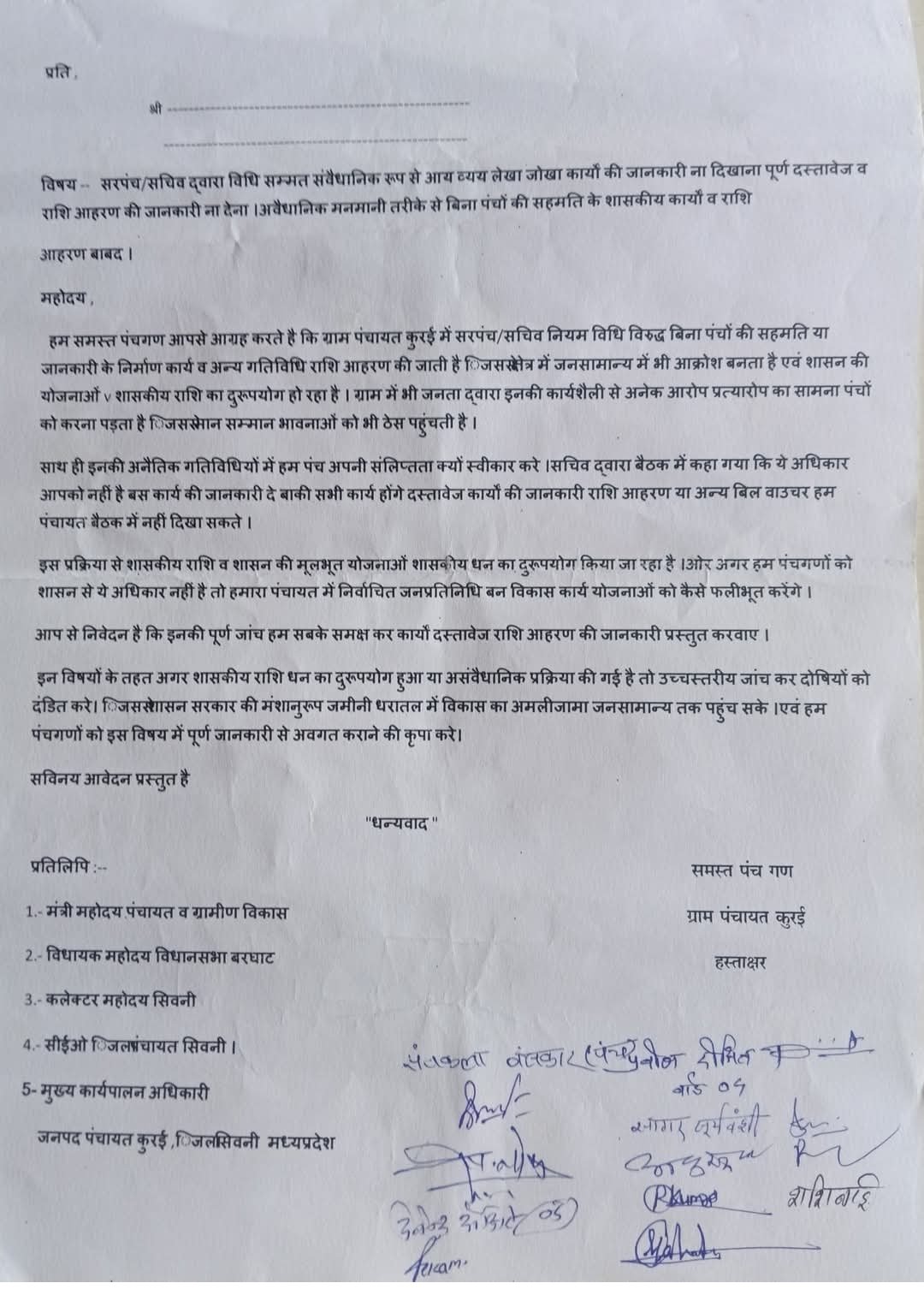 जिला पंचायत सदस्य राकेश सनोदिया (उपाध्यक्ष जिला पंचायत सिवनी ) एवं जनपद अध्यक्ष लोचनसिंह मर्सकोले आप इसी ग्राम पंचायत के नागरिक है एवं क्षेत्र विकास के लिए प्रयासरत है अतः आपसे सहयोग की अपेक्षा है भ्रष्टाचार अनैतिक असंवैधानिक इस कार्यप्रणाली में अंकुश लगा कार्यवाही सुनिश्चित करवाए ।