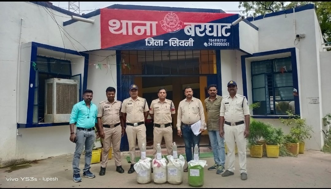 थाना प्रभारी बरघाट के नेतृत्व में तत्काल थाना स्तर पर पुलिस टीम द्वारा मूखबिर के बताये स्थान पर जाकर घेराबंदी कर एक आदमी को पकड़ा गया जिसके पास 15-15 लीटर वाली प्लास्टिक की 04 केन मिली उक्त व्यक्ति से नाम पता पूछने पर अपना नाम धर्मेन्द्र पिता स्व. सुरज विश्वकर्मा उम्र 22 साल निवासी ग्राम खूंट का रहने वाला बताया। उक्त व्यक्ति के पास रखी चारो केनो को चेक करने पर कुल 60 लीटर हाथ भट्टी कच्ची महुआ शराब करीब 6000 रूपये की रखी होना पाया गया। उक्त शराब के संबंध मे संदेही आरोपी से वैध दस्तावेज चाहने पर किसी भी प्रकार के कोई दस्तावेज नही होना बताया जो आरोपी धर्मेन्द्र विश्वकर्मा का कृत्य 34 (2) आबकारी एक्ट से दण्डनीय पाये जाने से कुल 60 लीटर हाथ भट्टी महुआ शराब किमती 6000 रूपये की समक्ष गवाहो के जप्त कर कब्जा पुलिस मे लिया गया। आरोपी के विरूद्ध धारा 34 (2) आबकारी एक्ट का पंजीबद्ध कर विवेचना में लिया गया है। आरोपी को गिरफ्तार कर न्यायिक रिमांड पर भेजा गया है।