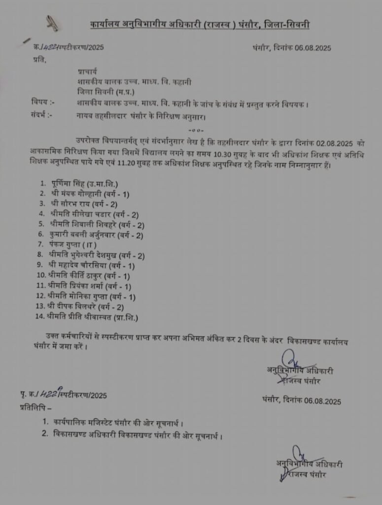 सिवनी – गैर न्यायिक तहसीलदार डी.एल. परते ने बीते दिनों शासकीय उच्चतर माध्यमिक विद्यालय कहानी का निरीक्षण किया निरीक्षण के दौरान सुबह 10.30 बजे शाला प्रारंभ होने के बाद भी लगभग 11.20 बजे तक 14 शिक्षक नियमित एवं अतिथि अनुपस्थित पाए गए। यह गंभीर लापरवाही शिक्षा विभाग की कार्यप्रणाली पर बडा सवाल खड़ा करती है। तहसीलदार द्वारा निरीक्षण रिपोर्ट अनुविभागीय दंडाधिकारी विशन सिंह को सौंपी गई, जिनके निर्देश पर घंसौर विकासखंड शिक्षा अधिकारी प्रसेन दीक्षित ने तत्काल कार्रवाई करते हुए सभी अनुपस्थित शिक्षकों का एक दिन का वेतन काटा और उनके विरुद्ध कारण बताओ नोटिस जारी किया।