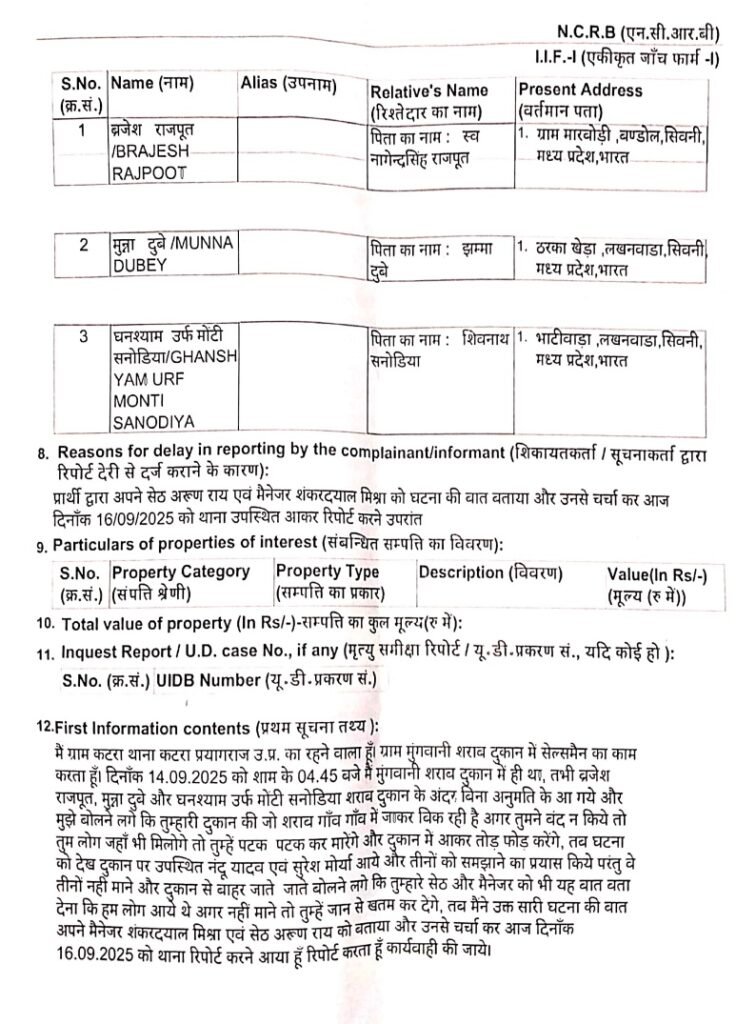 लेकिन इतना सब कुछ होने के बाद भी लोग अपने आप को कानून से उपर समझते है और स्वयं ही वकील स्वयं ही जज बनकर फैसला सुनाने लगते है ऐसा ही एक मामला प्रकाश में आया है जहां बंडोल थाने में आकर पीडित दुर्गेश पिता सूर्यप्रकाश मिश्रा निवासी ग्राम कटरा थाना कटरा प्रयागराज उत्तरप्रदेश इलाहाबाद जो कि अस्थाई रूप से मुंगवानी शराब दुकान जो कि बंडोल थानान्तर्गत आता है। पीडित ने बंडोल थाना पहुॅचकर पुलिस को बताया कि मै मुंगवानी शराब दुकान में सेल्समैन का कार्य करता हूॅं। दिनाॅंक 14 सितम्बर 2025 की शाम पौने पाॅच बजे मुंगवानी शराब दुकान के अंदर मै था तभी ब्रजेश राजपूत,मुन्ना दुबे और घनश्याम उर्फ मोंटी सनोडिया ने शराब दुकान के अंदर बिना अनुमति के प्रवेश किया और पीडित को बोलने लगे तुम्हारी दुकान की जो शराब गाॅव – गाॅव में जाकर बिक रही है अगर तुमने बंद न किये तो तुम लोग जहां भी मिलोगे तो तुम्हे पटक – पटक कर मारेंगें और दुकान में आकर तोड़फोड़ करेंगें तब घटना को देख दुकान में उपस्थित नंदू यादव एवं सुरेश मोर्या आये और तीनो को समझाने का प्रयास किया परंतु फिर भी तीनो अनावेदक नही माने और दुकान के बाहर जाते – जाते बोलने लगे कि तुम्हारा सेठ और मैनेजर को भी यह बात बता देना कि हम लोग आये थे अगर नही माने तो तुम्हे जान से खतम कर देंगें,तब मैने उक्त सारी घटना की जानकारी अपने मैनेजर शंकरदयाल मिश्रा एवं सेठ अरूण राय को बताया और उनसे चर्चा कर दिनाॅंक 16 सितम्बर 2025 को थाने में रिपोर्ट दर्ज कराई है। जिस पर पुलिस जाॅच करे और दोषियो के खिलाफ कठोर कार्रवाई करें।