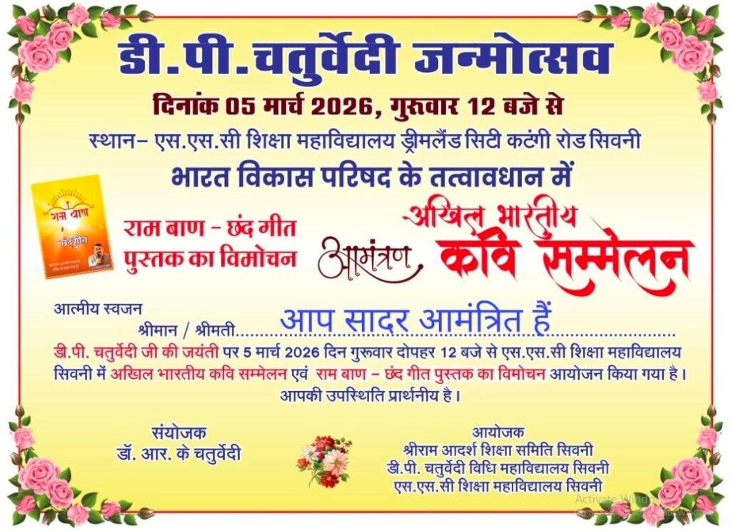 सिवनी – नगर के वरिष्ठ शिक्षाविद डीपी चतुर्वेदी के जन्मदिन पर पर अखिल भारतीय कवि सम्मेलन का आयोजन एसएससी महाविद्यालय ड्रीमलैंड सिटी में में किया गया है इस आयोजन को भारत विकास परिषद के तत्वाधान में रखा गया है 5 मार्च को दोपहर 12.00 से आयोजित कवि सम्मेलन में झांसी से वीर रस के पंकज अंगार अपनी रचना प्रस्तुत करेंगे वही दिल्ली से आई रजनी श्रीवास्तव गीत गजल से इस होली के पर्व को रंग से भरेंगी बैतूल से आए हरीश पांडे हास्य रचनाओं से वर्तमान विसंगतियों को आमजन के समझ सकेंगे बैतूल के राजकुमार राज भी अपनी रचनाओं से मंच को ऊंचाइयां प्रदान करेंगे सभी सुधी श्रोताओं से इस आयोजन में पधार कर इस कवि सम्मेलन का आनंद लेने की अपील संयोजक डॉ रामकुमार चतुर्वेदी ने की है।