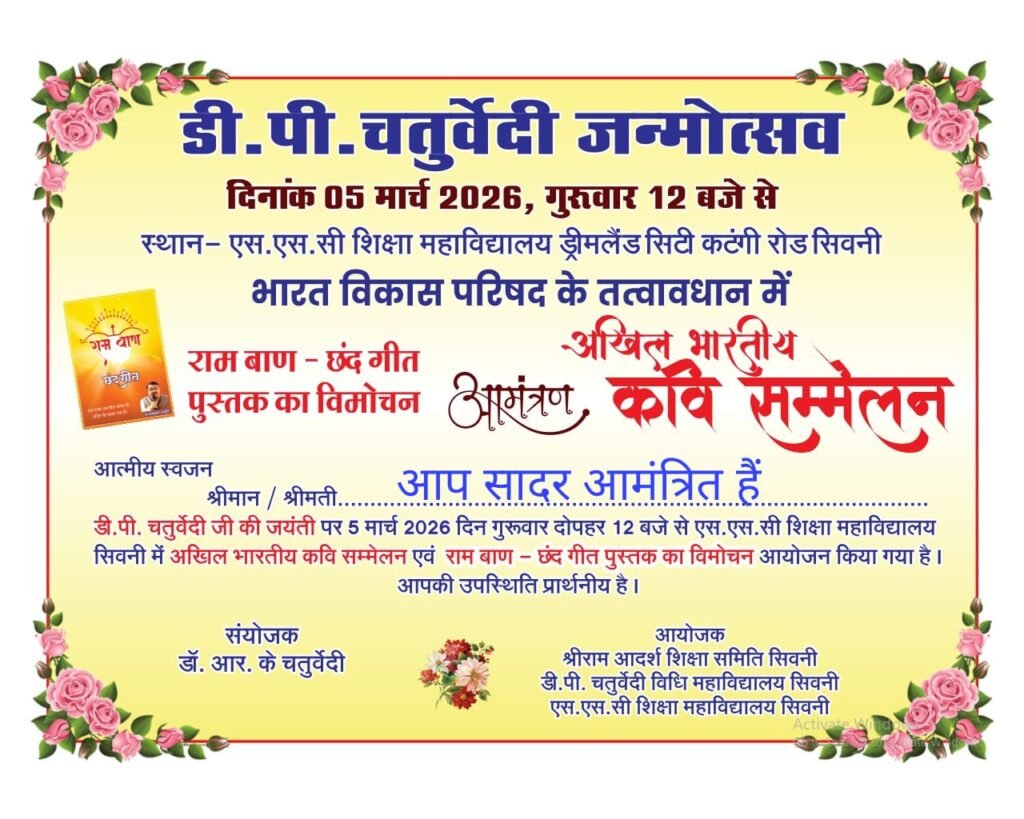 उन्ही की याद में भारत विकास परिषद के तत्वाधान में स्वर्गीय डी.पी. चतुर्वेदी के जन्मदिन पर अखिल भारतीय कवि सम्मेलन का आयोजन किया गया इस आयोजन में दिल्ली से आई रजनी श्रीवास्तव ने बुंदेली गीत हास्य तथा श्रंगार की रचनाओ से मंच को ऊंचाइयां प्रदान की वहीं झांसी के पंकज अंगार ने संवेदना के गीतों की प्रस्तुति दी बैतूल के हरीश पांडे ने बेटी को लेकर संवेदनशील रचनाओं की प्रस्तुति दी।